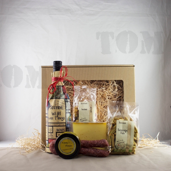 Delicatessenbox Boer Tom van onze Landwinkels kenmerkt zich door de fraaie fles kwaliteitswijn gehuld in een unieke verpakking. Drink hem met een stukje boerenkaas en worst. En heeft u onze smaakvolle ambachtelijke mosterd-dille dip al geproefd? Dat is smullen!